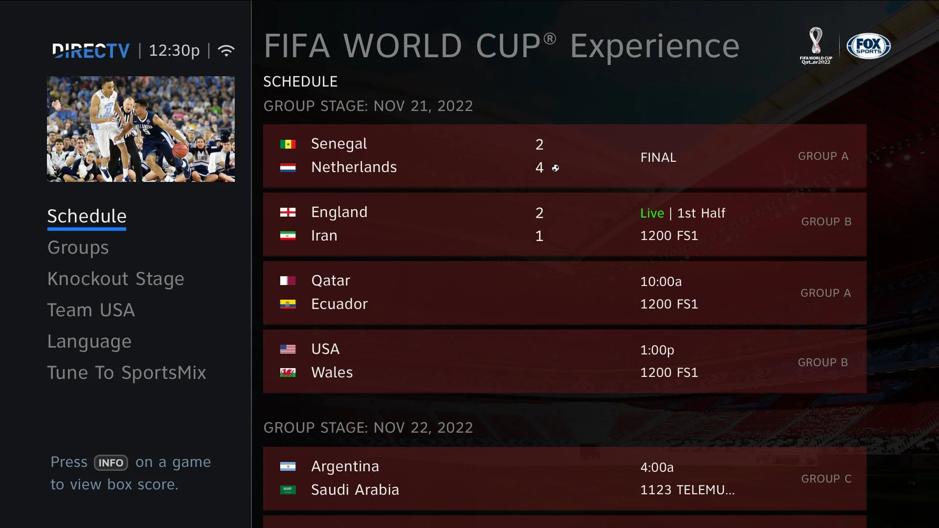 But this is a crucial space for users. This for me was a bit hard to understand. I myself have never been the type of fan to keep up with stats. So when I learned how the World Cup works, it kind of blew my mind. So in the group stage 4 teams all play against each other. The top two with the most points after six games gets to advance into the knockout stage. So I needed to have a place where users can come view those groups points, schedule, Group teams, Live stats and still have access to watch a live game and past games boxscore.